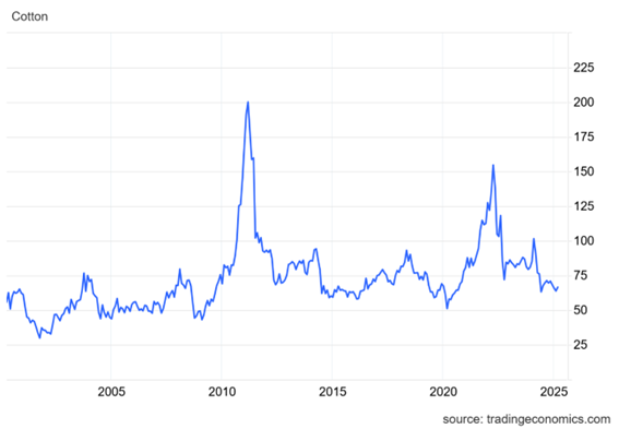 A evolução dos preços é crucial para entender o mercado. O gráfico abaixo, obtido de tradingeconomics.com, mostra o preço histórico do algodão de 2005 a 2025, com destaque para a recente desvalorização.